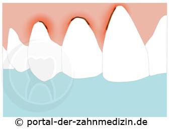 Wurzelzement, Wurzelhaut, Kieferknochen und Zahnfleisch sind die Bereiche, die bei einer Parodontitis entzündet sind und geschädigt werden. Eine Folge der Parodontitis ist der Schwund des Zahnfleisches und des Kieferknochens.