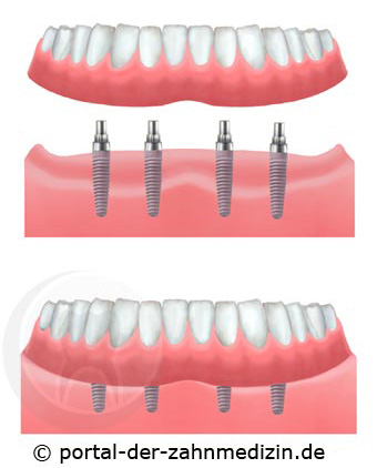 Eine Implantation kann von einem Zahnarzt, einem Kieferchirurgen oder einem Oralchirurgen durchgeführt werden. Im ersten Schritt erfolgt eine Abformung des Kiefers, sie ist für die Planung der Implantationspositionen und der Platzierung der Suprakonstruktionen erforderlich. Vor dem eigentlichen Eingriff sollten die restlichen Zähne behandelt werden und von Karies und Parodontitis befreit sein.